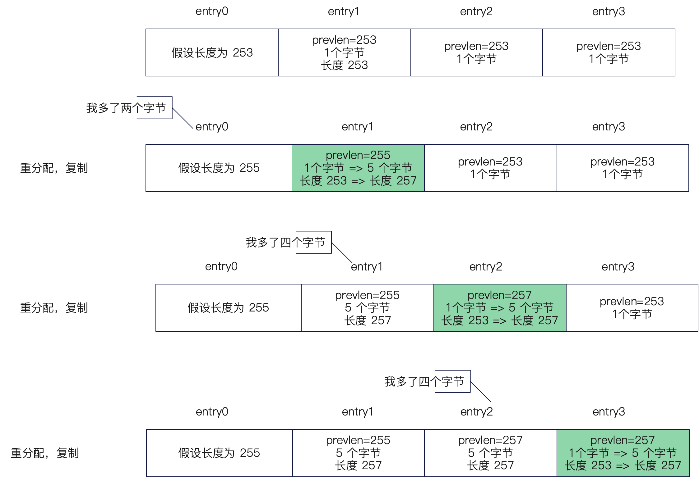 所以你就会发现,如果要是我的 content 原本很短,后来变长了,你长度不就要从 1 字节变成 5 字节吗?跟进一步,如果要是因为上一个长度需要改用 5 字节来记录,导致我自身长度也恰好超过 254,那么我的下一个 entry 岂不是也要改用 5 个字节来记录我的长度了吗?